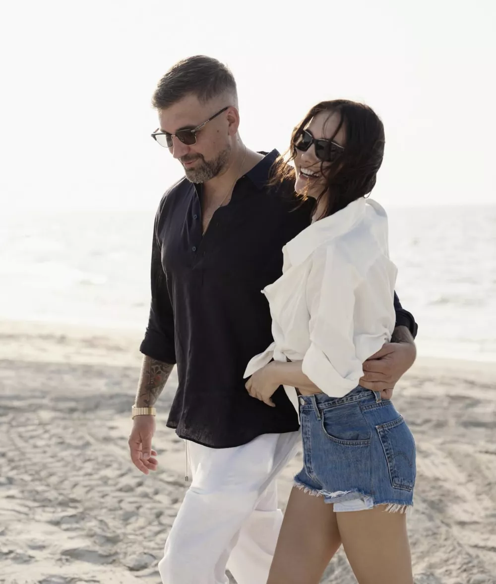 На фотографиях можно увидеть Басту в стильных солнцезащитных очках, облаченного в черную рубашку, который прогуливается вдоль моря, нежно обнимая свою любимую. Елена на этом кадре выглядит особенно привлекательно: на ней черный топ, короткая белая рубашка, завязанная под грудью, и короткие джинсовые шорты, а волосы распущены и развеваются на ветру. Такой наряд идеально подходит для прогулки по пляжу – супруга Басты дополнила образ стильными очками с темными стеклами, что придало ей дополнительный шарм. На снимках видно, как Елена с нежностью застегивает пуговицы на рубашке своего мужа, создавая атмосферу близости и доверия.