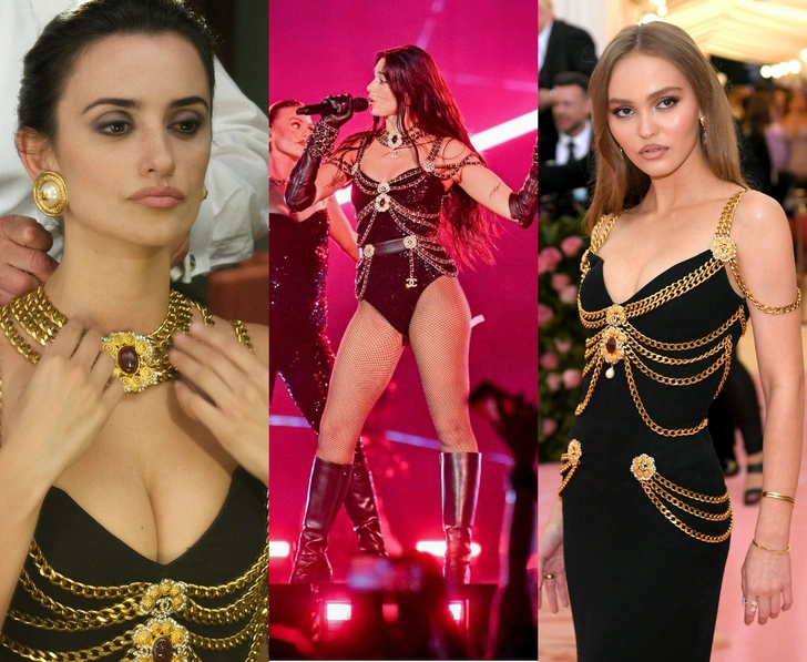 В финале своего тура Radical Optimism Дуа Липа появилась в кастомном Chanel, созданном как прямая дань тому самому кутюрному платью 1992 года. Черная сцепленная основа и каскад массивных цепей поверх боди буквально цитируют оригинал, просто адаптированный под энергичную сцену, танцы и прожекторы. То, что когда‑то было светским платьем для подиума и красных дорожек, превращается в униформу суперзвезды (читайте также: Секреты идеальных снимков — от Хейли Бибер до Дуа Липы: что нужно, чтобы их повторить?).