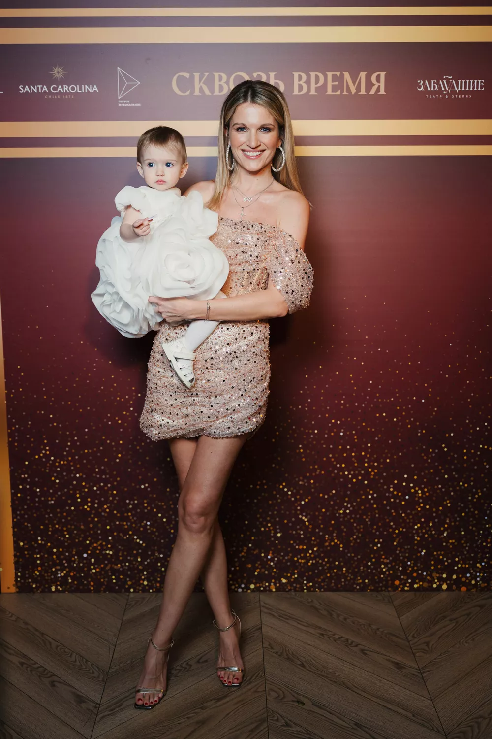 На презентации Женя появилась в маленьком золотом платье, усыпанном блестками, и лаконичных босоножках такого же цвета. Артистка распустила и выпрямила белокурые локоны, нанесла вечерний мейкап и надела массивные серьги-кольца.