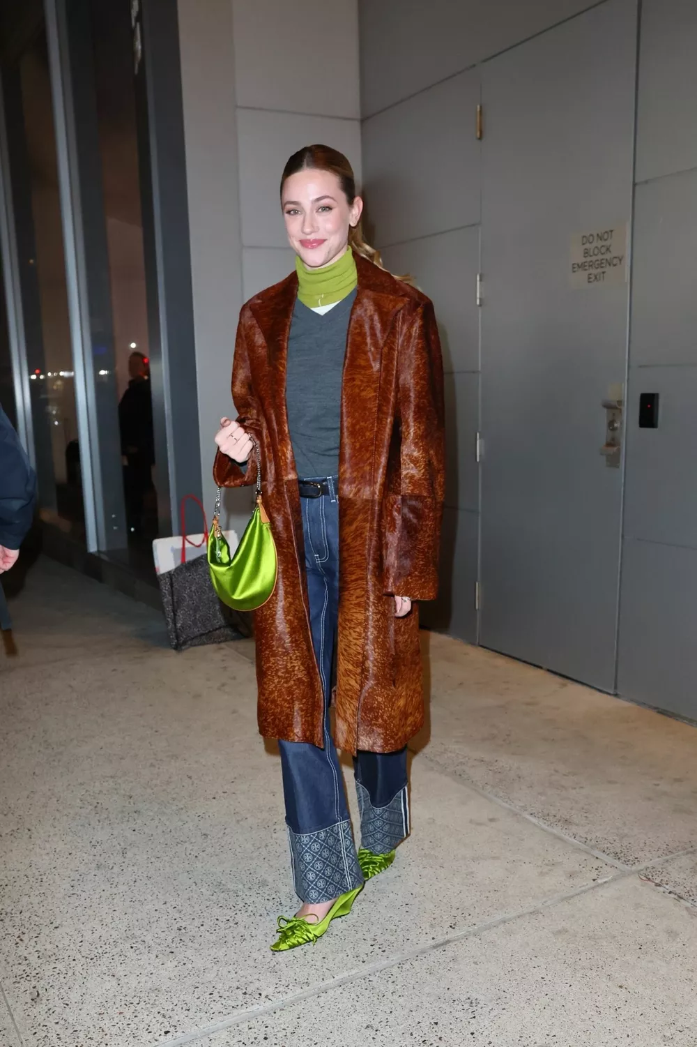 Такому принципу последовала 29-летняя звезда сериала “Ривердэйл” Лили Рейнхарт, накануне, 24 ноября, появившаяся на встрече с фанатами в Нью-Йорке. Лили облачилась в меховое пальто карамельного цвета, темно-серый джемпер и синие джинсы с эффектными подворотами, а дополнила образ ярко-салатовой сумкой-багетом, салатовыми лодочками на миниатюрной танкетке и таким же шарфом-снудом.