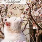 Белый кот нюхает цветы.
