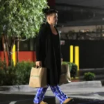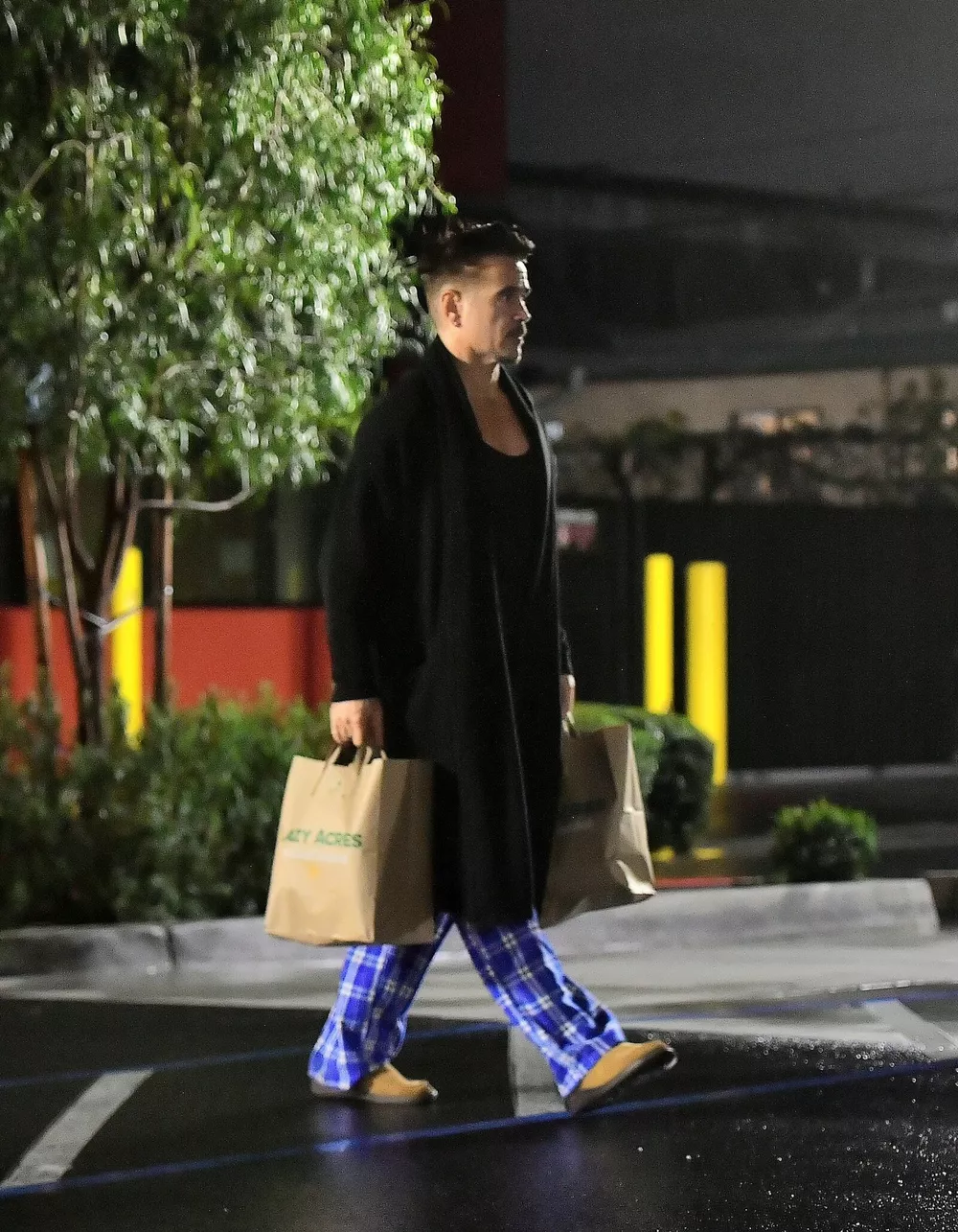 Голливудские папарацци сфотографировали 49-летнего Колина в дверях супермаркета, прямо с пакетами. Актер был одет в черный махровый халат, растянутую майку на бретельках, ярко-синие клетчатые пижамные штаны и замшевые мокасины. Фаррелл задумчиво глядел вдаль и спешил к своему авто, чтобы скорее довезти продукты до дома.