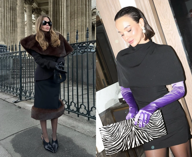 Лучший сценарий — костюм или строгие брюки с идеальной посадкой, лаконичное боди или шелковый топ и поверх — кейп из костюмной шерсти или структурного меха. Такой ансамбль выглядит дороже любого привычного палантина: кейп «собирает» линию плеч, подчеркивает шею и буквально «подсвечивает» лицо. Внизу — высокие сапоги или остроносые лодочки, небольшая структурированная сумка и длинные перчатки как финальный штрих.